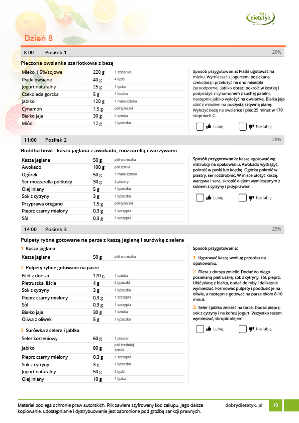 w formie precyzyjnych jadłospisów wielodniowych (na każdy dzień miesiąca jest opracowany osobny jadłospis). Tutaj nie musisz zastanawiać się co zjeść każdego dnia, gdyż będziesz mieć dokładnie wszystko rozplanowane.