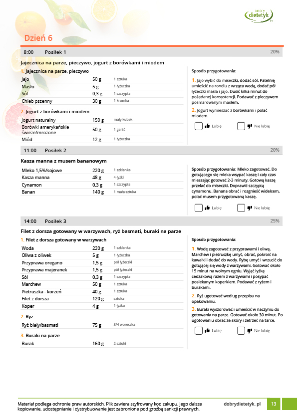 w formie precyzyjnych jadłospisów wielodniowych (na każdy dzień miesiąca jest opracowany osobny jadłospis). Tutaj nie musisz zastanawiać się co zjeść każdego dnia, gdyż będziesz mieć dokładnie wszystko rozplanowane.